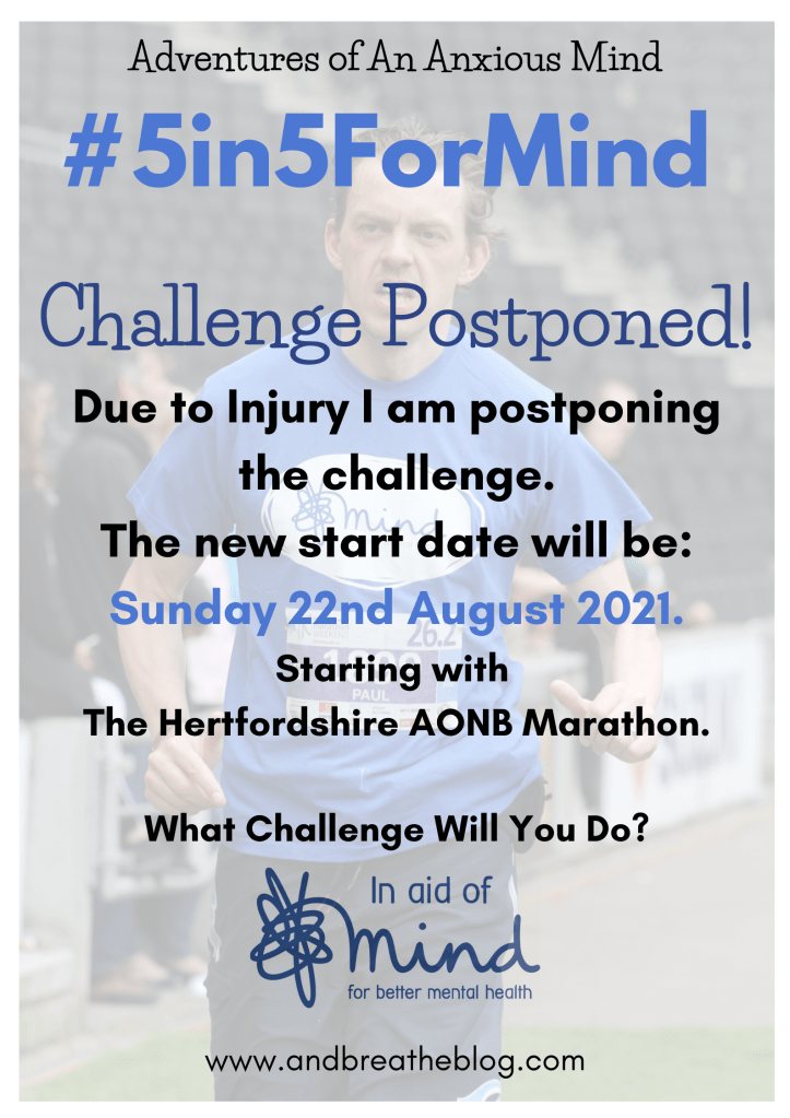 Unfortunately (as some of you will already be aware), I’ve had to postpone my #5in5formind marathon challenge, again! This time it’s because of an injury to my achilles.